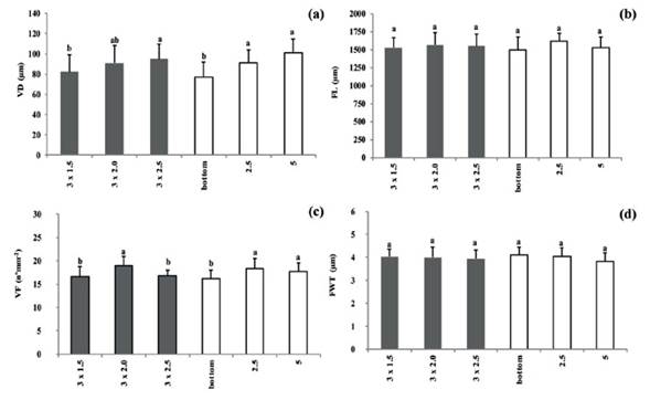 Planting spacing had no significant effect on any physical properties (Table 2 and Figures 1a, 1b, 1c, and 1d). As for the anatomical properties, the vessel diameter was significantly higher with a 3 x 2.5 m spacing than with 3 x 1.5 m (Table 2 and Figure 2a). However, the vessel frequency with a 3 x 2 m spacing was significantly higher than with 2 x 1.5 and 3 x 2.5 m (Table 3 and Figure 2b). Regarding the fiber length and the fiber wall thickness, no significant differences were observed among the three spacings (Table 2 and Figures 2c and 2d).