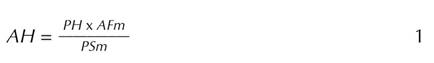 donde AH es el área de las hojas en m2, PH el peso de la hojas en kg, AFm el área de la muestra de las hojas en m2 y PSm el peso seco de la muestra de las hojas en kg.
