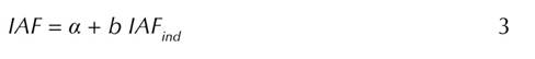 donde IAF es el índice de área foliar corregido, a y b son los coeficientes de la ecuación y IAF ind es la estimación indirecta del índice de área foliar.