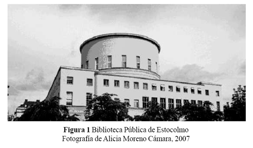 ''El espacio de un edificio debe poder leerse como una armonía de espacios iluminados. Cada espacio debe ser definido por su estructura y por el carácter de su iluminación natural. Aun un espacio concebido para permanecer a oscuras debe tener la luz suficiente proveniente de alguna misteriosa abertura que nos muestre cuán oscuro es en realidad''. Louis Kahn18 El modelo de planta circular cuenta con el valor de la luz natural en todas sus estancias lo que concede al edificio grandiosidad, pero en su detrimento las ampliaciones se antojan complicadas bien por el incremento del volumen bibliográfico, por la ampliación de servicios o por otras causas. Destacan: la Biblioteca Pública de Estocolmo.19 Fue diseñada por el arquitecto Eric Gunar Asplund. El periodo de construcción de la obra comprende desde 1921 a 1928, siendo modelo para muchas bibliotecas posteriores. El interior del perímetro del cilindro es utilizado para albergar libros, y el espacio central de la sala se encuentra destinado al estudio y consulta de bibliografía. Alrededor del cilindro se sitúan las zonas destinadas al personal de la biblioteca, a la sección de niños y jóvenes, a sala de cuenta cuentos y las salas de estudio y lectura (Ver Figura 1 ).