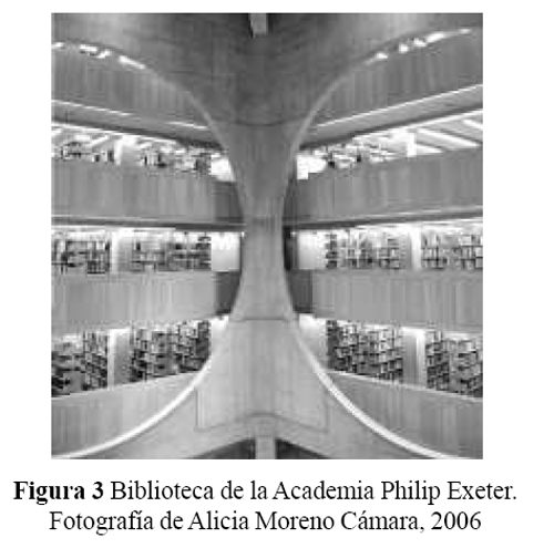 Biblioteca de la Academia Philip Exeter, (Ver Figura 3 ) del arquitecto Louis Isadore Kahn. Este arquitecto planteó la construcción de la biblioteca entre los años 1965 y 1971,23 en torno a un vacío central. Los depósitos dedicados a albergar los fondos giraban alrededor del vacío central y las áreas dedicadas al estudio se situaban rodeando el gran depósito, en lugares silenciosos y colmados de luz.24 Kahn daba importancia a la tranquilidad y el equilibrio, y ofrecía la posibilidad al usuario de salir al exterior del recinto a consultar bibliografía, por estar la biblioteca, rodeada de jardines. Otra peculiaridad de esta obra es la posibilidad de divisar y controlar la mayor parte de la sala desde el mostrador de préstamo.25