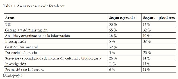 No obstante estos hallazgos, los egresados y empleadores manifiestan la necesidad de fortalecer las áreas de TIC, Administración, Análisis y Organización de la Información, Servicios, Gestión Documental y en aspectos relacionados con la investigación y la docencia, como se puede apreciar en el siguiente cuadro (Tabla 2).