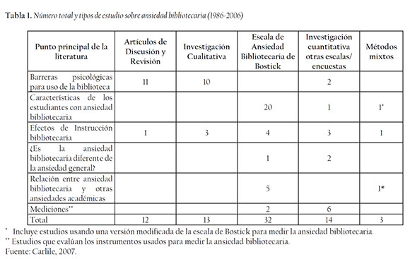 El panorama de la investigación sobre AB no ha sido estático. En una revisión hecha por Carlile (2007) que abarca el período de 20 años (1986-2006) se puede obtener una perspectiva de algunos tipos de estudio y los aspectos abordados (ver Tabla 1). Un buen número de las investigaciones llevadas a cabo en esta temática se relacionan con la comprensión del fenómeno en términos de quiénes son los afectados, cómo los afecta y demostrar que la ansiedad bibliotecaria es real y perjudicial. Algunos pocos se han enfocado en identificar cuál es la mejor aproximación para tratarla y reducirla (Malvasi, Rudowsky & Valencia, 2009).