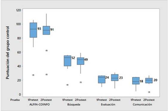 Los resultados descriptivos iniciales muestran que se mantienen, en el pretest y el postest, las puntuaciones de la percepción de la ALFIN y sus dimensiones búsqueda, evaluación y comunicación de la información de los estudiantes del grupo control (Figura 1).