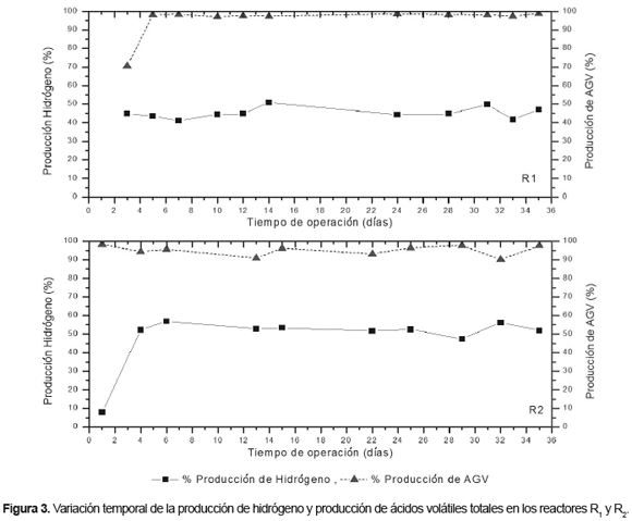En este estudio, se considera que la producción de ácidos volátiles totales para los reactores R1 y R2 fue estable durante los 35 días de operación. En la Figura 3 se muestra que en ambos reactores la concentración de AVT del efluente fue mayor al 90%. A pesar que la producción de AVT fue alta, la producción de hidrógeno no superó el 50% para ninguno de los dos sistemas, indicando que no siempre la presencia de ácidos volátiles conlleva a optimizar la producción de hidrógeno. Un estudio realizado por Cardeña R et al. [33], indican que producciones altas de ácidos volátiles inhiben la producción de hidrógeno, estos autores observaron valores de producción de hidrógeno entre 77 y 87% y valores de AVT entre 21 y 51%, por lo que concluyeron que valores bajos de AVT contribuyen al alto rendimiento en la producción de hidrógeno. Esta misma observación la indican autores como Trad Z et al. [34]. Por lo cual, regular la producción de AVT en los reactores anaerobios utilizados para producción de hidrógeno puede ser un indicador para mejorar la estabilidad y rendimiento.