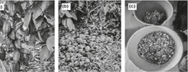 Figura 1. Obtención de la biomasa vegetal cáscara de cacao Theobroma cacao L. Donde (a) corresponde al fruto de cacao Theobroma cacao L. en el cultivo; (b) biomasa vegetal cáscara de cacao y (c) troceado de cáscara de cacao.