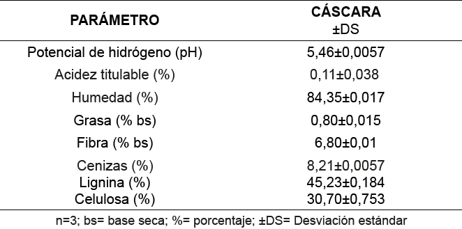Para la determinación de pH de utilizó un potenciómetro con el método AOAC 981.12 [10], el porcentaje de acidez titulable teniendo en cuenta la metodología propuesta por la norma AOAC 939.05 [11], el porcentaje de humedad con la AOAC 20.013 [12]. El porcentaje de grasa se determinó por el método Soxhlet NTC 1142 [13] el porcentaje de fibra mediante la AOAC 962.09 [14], la determinación del contenido de cenizas se llevó a cabo empleando una mufla TERRIGENO teniendo en cuenta la norma TAPPI 211 om-85 [15]. Finalmente, se determinaron las variables de porcentajes de lignina y celulosa, donde la determinación de lignina se llevó a cabo según lo establecido por la norma TAPPI 222 om-88 [16]; la variable de porcentaje de celulosa se realizó empleando la norma NTC 697 [17].