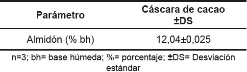 El porcentaje del almidón por vía húmeda realizado a la biomasa vegetal de cáscara de cacao, se muestra en la tabla 2.