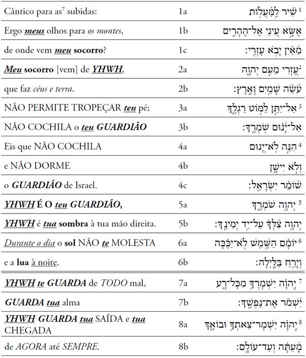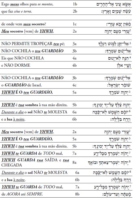 Dentro da poética semítica, com exceção do Sl 132, neste conjunto, todos os salmos são formados de versos elegíacos2, com estíquios3 desiguais, e utilizam frequentemente o ritmo gradual: as mesmas palavras ou expressões são retomadas em eco de um verso para o outro, conforme podemos ler na edição da Bíblia de Jerusalém (2017, p. 997, n. b.). Esta característica é acentuada na poesia hebraica presente no livro dos Salmos e está bem assinalada no Sl 121, o que possibilita utilizar os pressupostos e a metodologia da Análise Retórica Semítica Bíblica para o seu estudo, percebendo as repetições (primeira figura de retórica que marca a função de insistência) (cf. Meynet, 1993, p. 392; Ballarini; Reali, 1985, p. 19), as relações entre os membros, as semelhanças e contrastes em seus versos, os paralelismos e antíteses (cf. Gonzaga, 2018, p. 159), além de um quiasmo interno perfeito - em um único verso (v. 6a-b) - e outros elementos poéticos e retóricos encontrados na beleza do ritmo do salmo. Aliás, Weiser afirma que "até os dias de hoje este salmo produz profunda impressão pela simplicidade de sua linguagem e por sua piedade" (1994, p. 580) e que do mesmo brota uma firmeza interior que "extravasa para o leitor", vistas as várias afirmações de confiança que encontramos nos vv. 2-8. Segundo Ravasi, o gênero do Sl 121 "seguramente é o da confiança" (1997, p. 521).