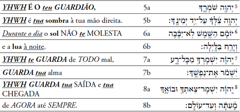 O guardião do salmista e/ou do(a) ouvinte-leitor(a) a quem é direcionado o sufixo de segunda pessoa precisa ser reforçado a fim de lhe garantir, pela repetição, a ação individual de YHWH guardião de todo o tempo. Sua ação coletiva também se faz presente. Importa observar, ainda, que o desdobrar de um crescendo ocorre: o teu guardião (ainda não revelado, mas subtendido) é também o guardião de Israel (ainda não revelado): o teu guardião é YHWH (revelado e identificado), aquele que guarda o(a) peregrino(a) na caminhada, como guarda Israel qual um pastor zeloso a seu rebanho (cf. Kraus, 1995, p. 632).