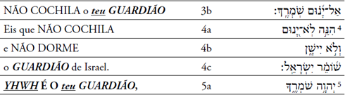 Encerra-se a primeira parte do salmo, ao mesmo tempo em que a costura faz duas laçadas e um ponto no meio que vão à repetição de três particípios do mesmo verbo: dois deles (as "laçadas") determinados com sufixo de segunda pessoa - o teu guardião que não cochila (v. 3b) / o teu guardião é YHWH (v. 5a); e um no meio (o "ponto") acompanhado do determinante - o guardião de Israel não cochila (v. 4b). Infira-se a morfologia e semântica do alcance temporal do particípio para pensar na ação de YHWH guardião: sua proteção é contínua - não é finita em um tempo. É livre das amarras de passado, presente e futuro. Acontece todo o tempo. Riqueza gramatical e perícia na pena do salmista e na agulha do que costura. Obra de mãos de artista!