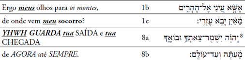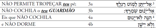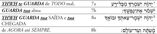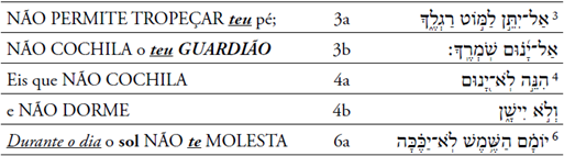 Digno de nota, ainda, é o alcance temporal presente nos verbos do Sl 121, bem como a quantidade de verbos com semântica correspondente a YHWH socorrista e guardião do salmista e do seu povo. Os verbos precedidos da negativa
