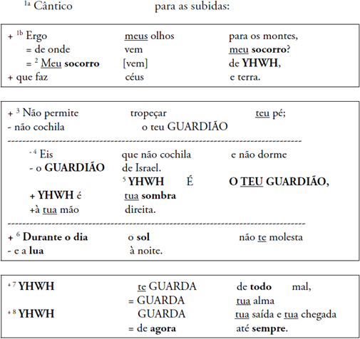 Até mesmo as relações antitéticas que ocorrem no Sl 121 corroboram o alcance do socorro, auxílio e proteção de YHWH para com o salmista, o(a) peregrino(a), o(a) ouvinte-leitor(a). O(a) viajante em nada precisa temer, pois tem consciência de estar "sob o patrocínio de Deus" (Weiser, 1994, p. 583). Diante da laçada maior, que é perceber YHWH como o teu guardião (v. 5a), estas relações são "laçadas menores", que se encontram dentro dos membros e/ou dos bimembros: