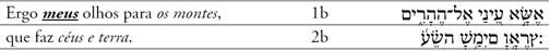 Enfim, os dois segmentos dos vv. 1-2 se correspondem, como que num espelho, de termo em termo, visto seus "termos médios": "meu socorro" e "de YHWH" correspondem a "de onde virá"; os "montes" correspondem aos "olhos que se elevam"; o "eu" do salmista parece corresponder à "terra", de onde se olha em direção ao céu; o salmista se encontra na terra, que é o oposto do céu. O segundo segmento responde à questão do primeiro segmento. A questão é saber de quais montanhas se tratam e o que elas representam.