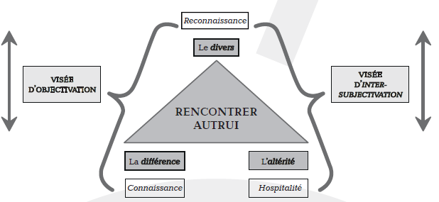En effet, permettre à autrui d'obtenir des droits ou de les faire reconnaitre, nécessite, bien sur, au préalable une démarche d'objectivation; en d'autres termes, il convient de nommer, d'identifier et d'opérer une classification rigoureuse. Cependant, antérieurement, mais aussi postérieurement à cette pratique classificatrice, il existe d'autres modalités de la relation, comme celles des liens affectifs, de la valorisation des potentialités, des compétences ou des capacités de l'autre. Or, sur ce plan, il s'agit moins de mobiliser un savoir sur autrui (appréhension de sa différence) que d'accueillir un être humain, de valoriser une singularité (altérité), de faire émerger une capacité de subjectivation et de construction de liens (le divers). En ce sens, la connaissance s'articule avec la visée d'objectivation, alors que l'hospitalité a partie liée avec la recherche d'inter-subjectivation, autrement dit, la structuration de sujets humains en relation les uns avec les autres; et ce, sans que s'exprime une attention précise quant à leur identité (accueil inconditionnel).