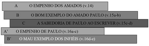 Obtém-se, assim, uma disposição quiástica com relação aos membros, na qual o segmento bimembro «κατὰ τὴν δοθεῖσαν αὐτῷ σοφίαν ἔγραψεν ὑμῖν/conforme a sabedoria que lhe foi dada, vos escreveu» ocupa uma centralidade. O segmento bimembro do v.15c-d, por sua vez, divide esta perícope em outras duas partes: na primeira, começa e termina com a palavra «ἀγαπητὸς/amado»; na segunda, começa e termina com a expressão «ὡς καί/como também». Cada uma dessas partes tem dois segmentos, um trimembro e outro bimembro. Assim, obtemos a estruturação da perícope 2Pd 3,14-16: