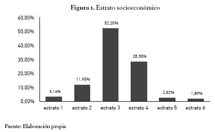 Como es bien sabido, en la mayoría de las ciudades colombianas se ha implementado un sistema de estratificación de las viviendas. Este permite mantener tarifas diferenciadas en los servicios públicos. Si bien, se reconocen sus limitaciones, se utiliza el estrato de las viviendas como indicador de la situación económica de los encuestados. Especialmente por la renuencia cultural a responder preguntas sobre el monto de los ingresos económicos4. En las principales ciudades colombianas, la escala de estratificación se extiende del uno al seis. En términos generales, se puede decir que las viviendas de estratos uno y dos están habitadas por los hogares de menores ingresos. Mientras que los inmuebles de estratos cinco y seis están habitadas por aquellos que disponen de mayores recursos. Tal y como lo muestra la Figura 1, la mayoría de los egresados (el 80,5 %) habitan en inmuebles de estrato 3 y 4, que suelen asociarse con la clase media colombiana.