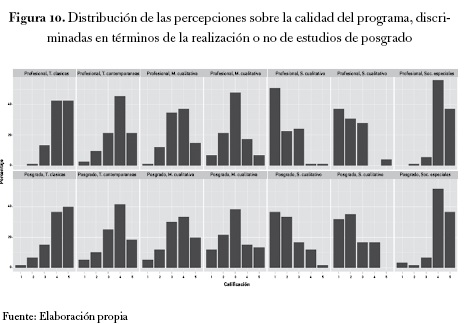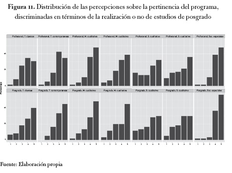 En las figuras 10 y 11, se puede observar cómo varía la percepción que tienen los egresados sobre la calidad y la pertinencia del programa, diferenciado entre quienes tienen o no estudios de posgrado. La sección inferior de las tablas corresponde a quienes tienen estudios de posgrado, la sección superior a quienes no los tienen. No se diferencian en las tablas los diferentes niveles de posgrado (especialización, maestría o doctorado). Esto obedece a que los porcentajes de egresados consulados en cada una de estas modalidades es demasiado bajo.