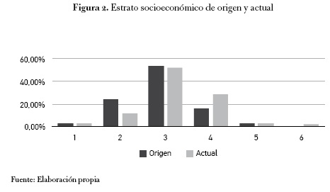 Al comparar este dato con el correspondiente al estrato del núcleo familiar del encuestado en el momento de iniciar sus estudios de sociología, se observa una reducción de un 12,58 % en la cantidad de individuos pertenecientes al estrato dos y un aumento de casi la misma proporción (11,95 %) entre los egresados que ahora habitan viviendas de estrato cuatro.