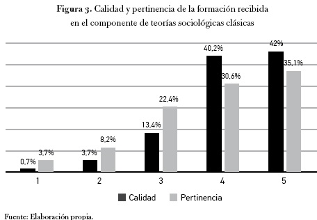 El 44 % de los egresados consideraron que la formación que recibieron en lo relacionado con las teorías sociológicas contemporáneas fue buena, y le otorgan una calificación de cuatro, el 19,2 % le otorgó cinco. Por su parte, la mayoría de los encuestados consideran muy pertinentes los conocimientos que adquirieron en esta área; cuando se les interrogó al respecto, el 38,9 % de los encuestados le asignó la máxima calificación (cinco) y el 38,8 % le dio la calificación de cuatro.