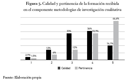 La mayoría de los encuestados manifestó no haber recibido una formación satisfactoria en metodologías de investigación cualitativas. La calificación modal que le otorgaron a la calidad de la formación recibida en este componente fue de tres (asignada por el 33 % de los encuestados). Cerca de la mitad de los egresados se sienten insatisfechos con la formación que recibieron en esta área a lo largo del pregrado. Así mismo, el 46,6 % de los encuestados le otorgó la máxima calificación (cinco) a la pertinencia de una buena formación en métodos cualitativos para el desempeño profesional. Con frecuencia los espacios laborales donde se desempeñan los egresados exigen un buen manejo de métodos cualitativos.