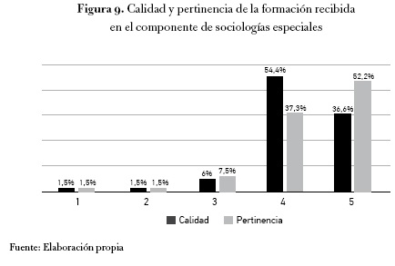 Más de la mitad de los encuestados le otorgó una calificación de cinco a la pertinencia de las sociologías especiales en el desempeño profesional, y más del 90 % le otorgó una calificación de entre cuatro o cinco a la hora de evaluar la calidad de la formación recibida en ese núcleo en particular. Así, entre los diferentes componentes del programa, este fue el mejor evaluado tanto en pertinencia como en calidad.