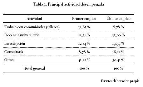 En la actualidad, además de las universidades, los principales contratantes de sociólogos son ONG y entidades estatales, tanto nacionales como regionales, dato que corrobora investigaciones anteriores (Martínez et al., 2007; Cubides, 1998; Cataño, 1986). Sin embargo, las vacantes laborales que ofrecen estas entidades no están, en términos generales, destinadas a sociólogos sino a "científicos sociales" (sociólogos, antropólogos, trabajadores sociales, psicólogos y politólogos) (Gómez, 2010, p. 71). Tal y como lo habían advertido estudios previos (Restrepo, Castellanos y Restrepo, 2007, p. 151), ninguno de los egresados consultados se desempeña en la altas esferas del poder público (en las ramas legislativas, ejecutiva o judicial), ni en cargos importantes de la empresa privada.