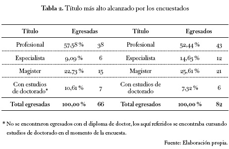 Los títulos de posgrado (maestrías y doctorados) son una expectativa creciente a la que deben enfrentarse todos aquellos que desean consolidar una carrera en la docencia universitaria, mejorar su remuneración o ganar competitividad en el mercado labor. La siguiente tabla muestra la población de egresados distribuida de acuerdo con los niveles de formación posgraduada alcanzados.