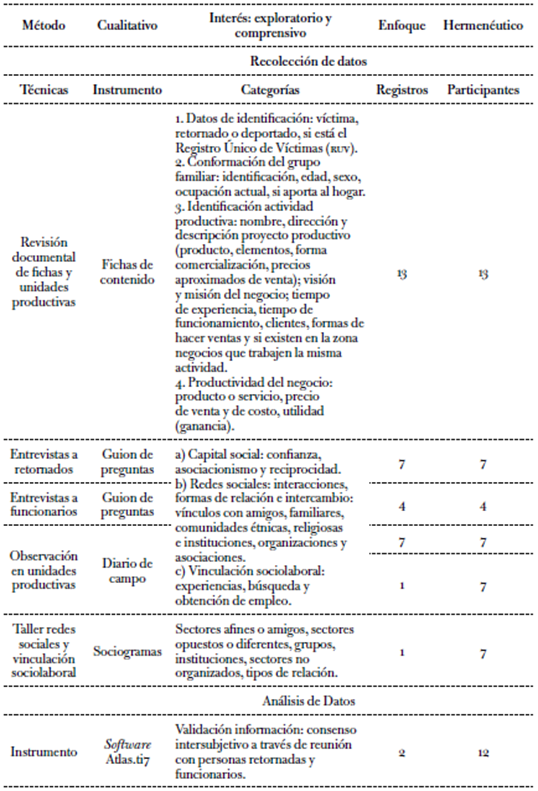 Esta metodología participativa y reflexiva permitió la observación de los observadores, sus posiciones discursivas al formular dudas, críticas u opiniones, aspectos que fueron importantes para el rigor metodológico del análisis de sus redes. Se aplicaron entrevistas a personas retornadas y a funcionarios SJR en Cúcuta durante el año 2017. Se transcribió la información en el software de análisis cualitativo Atlas ti.7. La validación se hizo en tres momentos: el primero, dirigido a construir los fundamentos epistemológicos y teóricos en concordancia con el método seleccionado; el segundo, para verificar la coherencia del modelo teórico con el diseño y los datos obtenidos, y el tercero, hacia la verificación del proceso de análisis e interpretación de la información encontrada con las personas retornadas y Área Integración local del SJR a través de un conversatorio. Véase tabla 1.