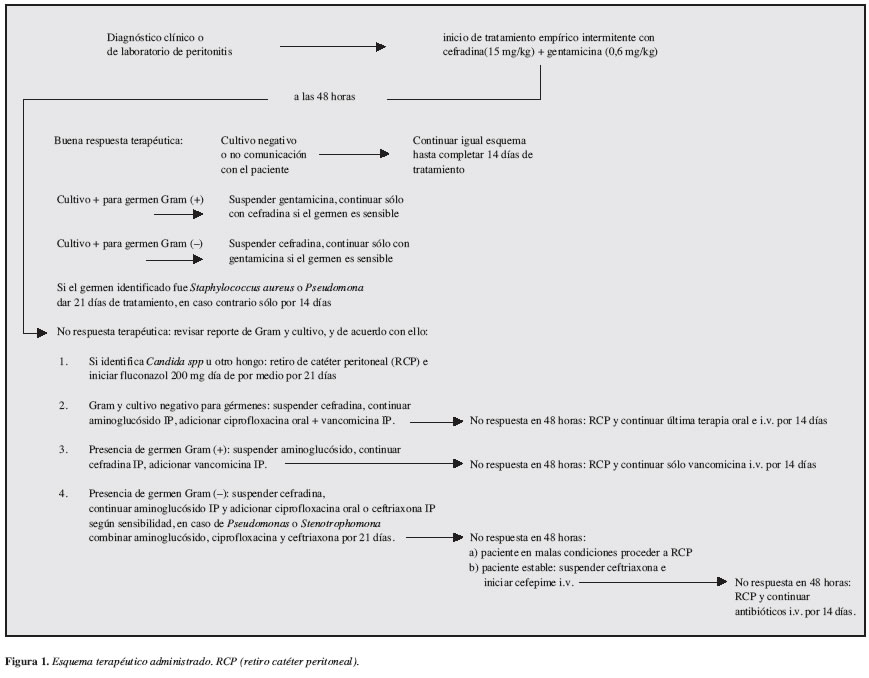 Métodos: pacientes a los cuales se les confirmó la peritonitis se les administró un esquema antibiótico intraperitoneal empírico que cubría infecciones por bacterias Gram (+) y Gram (), este esquema fue cefradina (15 mg/kg) y gentamicina (0,6 mg/kg) en dosis única diaria con un tiempo mínimo en cavidad peritoneal de seis horas, en caso de no obtenerse un buen resultado en 48 horas se procedió a adicionar un segundo antibiótico dependiendo del resultado del Gram, cultivo y antibiograma del líquido peritoneal.