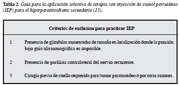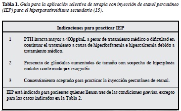 El etanol intraglandular para el tratamiento del hiperparatiroidismo secundario fue utilizado por primera vez en 1985 por Solbiati y cols como una alternativa a la paratiroidectomía en 12 pacientes urémicos de alto riesgo quirúrgico o que se rehusaban a que se les practicara, reportándose efectos clínicos y bioquímicos satisfactorios en la mayoría de los pacientes (39,40), iguales resultados reportan Kitaoka y cols en Japón quienes intervinieron nueve pacientes con glándulas paratiroides de gran tamaño (41), Kakuta y cols en 46 pacientes seguidos durante un año con excelente respuesta en el 80% de ellos (42, 43) y Tanaka y cols en 33 pacientes (44).