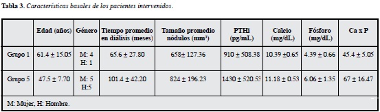 Pacientes, material y métodos: durante un periodo de recolección de dos años se identificaron sujetos con ERC estadio 5 en terapia dialítica (hemodiálisis o diálisis peritoneal), mayores de 18 años, quienes presentaran niveles de PTHI séricos mayores a 600 pg/mL, e hiperplasia de glándulas paratiroides autónoma (volumen mayor a 500 mm3) confirmada por ultrasonografía de cuello. Bajo visión ecográfica se les aplicó etanol en cada glándula hiperplásica, volumen dependiente de tamaño glandular para un máximo de dos aplicaciones por glándula con un intervalo de 30 días; si habían más de dos glándulas alteradas sólo se permitió la infiltración de dos glándulas por sesión. Quince sujetos fueron sometidos a la terapia, en el grupo 1 (G1) se incluyeron cinco sujetos con una sola glándula hiperplásica, el grupo 5 (G5) incluyó diez sujetos con más de una glándula hiperplásica: grupos 2, 3 y 4 cada uno con tres, dos y cinco sujetos con dos, tres y cuatro glándulas hiperplásicas respectivamente. Los niveles de PTHi se evaluaron a los 30, 60, 90 y 120 días posterior a la última aplicación, al igual que las variables calcio, fósforo, producto calcio-fósforo y hemoglobina. La fosfatasa alcalina se evaluó inicialmente y a los tres meses.