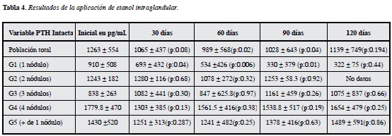 Resultados: la administración de etanol intraglandular disminuyó los valores de PTHI significativamente en la población total de sujetos desde un valor basal de 1263 ± 554pg/mL a 1065 ± 437pg/mL (valor p: 0.08), 989 ± 568pg/mL (valor p: 0.02), 1028 ± 643pg/mL (valor p: 0.04) y 1139 ± 749pg/mL (valor p: 0.194) a los intervalos previamente descritos. En el análisis de grupos se observó que sólo el G1 presentó una reducción significativa en los valores de PTHI, con disminución de un valor basal promedio de 910 ± 508pg/mL a 693 ± 432 (valor p: 0.04), 534 ± 426 (p: 0.006), 330 ± 379 (p: 0.01) y 322 ± 75 (p: 0.44). En los otros grupos consolidados en el grupo 5 (G5) con más de una glándula hiperplásica los valores de PTHI no se modificaron en forma importante, siendo su valor inicial 1430 ± 520pg/mL y sus valores posteriores 1251 ± 313 (p: 0.287), 1241 ± 482 (p: 0.255), 1378 ± 416 (p: 0.635) y 1489 ± 591 (p: 0.869). Los valores de calcio, fósforo, producto calcio-fósforo y fosfatasa alcalina, se disminuyeron en todos los grupos en forma no significativa, probablemente por el corto tiempo de seguimiento. El evento adverso más frecuente fue dolor y sensación de quemazón que se extendió de 5-10 segundos en el área inyectada, con presencia de hipotensión en un sujeto y disfonía en tres sujetos, resolviéndose con fonoaudiología en el curso de tres meses. Todos los sujetos con falla terapéutica fueron referidos a cirugía de cabeza y cuello con intención de paratiroidectomía, con hallazgos de grandes bandas fibrosas durante la cirugía en los ocho pacientes operados a la fecha.