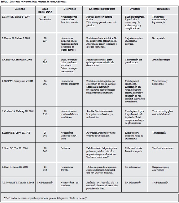 Se realizó una búsqueda de la literatura publicada en PUBMED durante los últimos 20 años con los siguientes términos: («Anorexia Nervosa» [Mesh]) AND «Pneumothorax» [Mesh]), («Anorexia Nervosa» [Mesh] AND («blister» [MeSH Terms] OR «blister» [All Fields] OR «bulla» [All Fields]), y («Anorexia Nervosa» [Mesh] AND «Emphysema» [Mesh]). Además, se hizo una segunda pesquisa en EMBASE con los mismos términos. En total se encontraron solamente nueve casos publicados: en siete de ellos se presentó neumotórax, en uno bulas, bronquiectasias y enfisema; y en otro solamente enfisema asociado a anorexia. En la Tabla 2 se resumen los datos más relevantes de dichos reportes de caso.