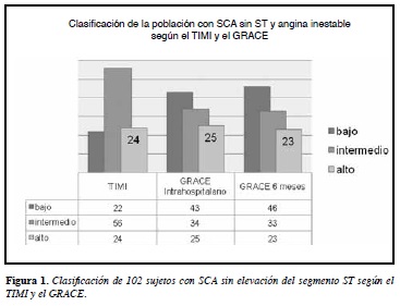 Background: risk stratification is one of the main objectives in the comprehensive management of acute coronary syndromes (ACS). Currently, clinical practice guidelines recommend stratification by the TIMI and GRACE risk scores. Given the high prevalence of this disease, we attach great importance to know in our environment the usefulness of these scales for the comprehensive treatment of our patients with ACS and determine which scale has better predictive power for morbidity and mortality.