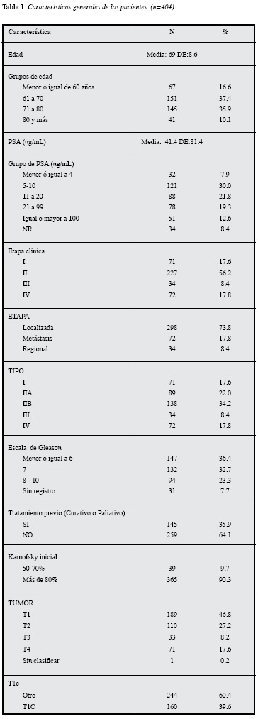 Mediante un estudio descriptivo de seguimiento se analizaron 404 casos de pacientes con cáncer de próstata, con las características descritas en la Tabla 1.