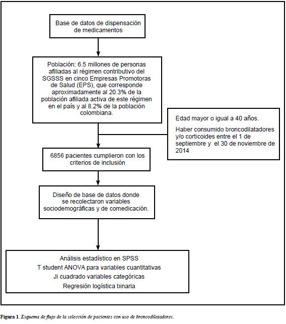 Se realizó un estudio de corte transversal, sobre una base de datos poblacional de 6.5 millones de personas afiliadas al régimen contributivo del SGSSS en cinco Empresas Pro-motoras de Salud (EPS o aseguradores), que corresponde aproximadamente a 20.3% de la población afiliada activa de este régimen en el país y a 8.2% de la población colombiana, entre el 1º de septiembre y el 30 de noviembre de 2013. De esta población se seleccionaron los datos de individuos con dispensación de broncodilatadores y/o corticoesteroides inhalados, atendidos en consulta médica y cuyo tratamiento se mantuvo durante al menos tres meses.