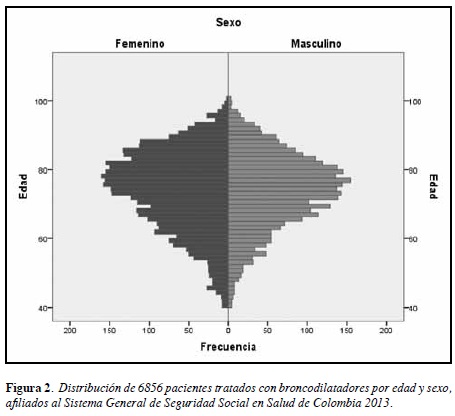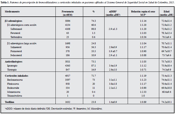 Material y métodos: estudio descriptivo observacional con pacientes, mayores de 40 años de ambos sexos, afiliados al Sistema General de Seguridad Social en Salud, en tratamiento continuo con broncodilatadores y/o corticoides inhalados entre septiembre y diciembre del año 2013, seleccionados a partir de una base de datos de dispensación de 6.5 millones de personas. Se recolectaron variables sociodemográficas, farmacológicas (fármacos con sus dosis diarias definidas), medicamentos concomitantes y clínicas (comorbilidades). Análisis mediante SPSS 22.