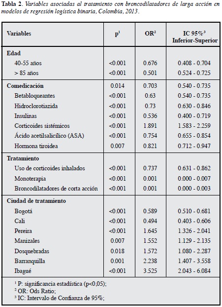 En análisis multivariado de las variables asociadas con el uso BDLA encontró que tener entre 40 y 55, o más de 80 años, recibir alguna medicación concomitante, utilizar corticoides inhalados, emplear monoterapia broncodilatadora y ser tratado en las ciudades de Bogotá y Cali se asociaron de manera estadísticamente significativa con menor riesgo de recibir BDLA; mientras que las variables uso de corticoide sistémico y ser tratado en las ciudades de Pereira, Manizales, Dosquebradas, Barranquilla e Ibagué se asociaron con mayor riesgo de ser tratados con éstos (Tabla 2).