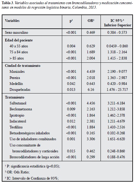 Al analizar mediante regresión logística binaria la relación entre el empleo de medicación concomitante y otras variables, se encontró que la edad mayor de 75 años, recibir salbutamol, beclometasona, ipratropio, indacaterol, teofilina, el uso de inhaladores combinados, ser tratado en las ciudades de Manizales, Pereira y Dosquebradas presentaron una asociación estadísticamente significativa con el uso de alguna medicación concomitante en estos pacientes, mientras que ser hombre, tener entre 40 y 55 años, el uso de β2-adrenérgicos inhalados, el empleo concomitante de broncodilatadores y corticoides y el uso de BDLA se asociaron con un menor riesgo de ser comedicados para otra morbilidad (Tabla 3).