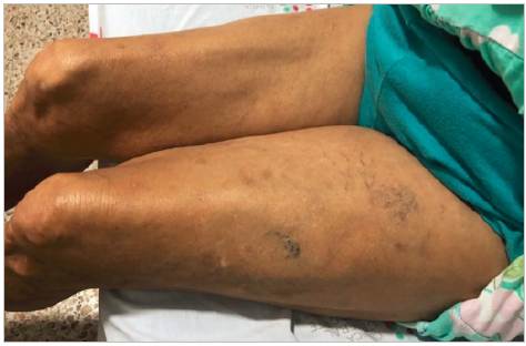 Her vital signs were normal on admission. On physical exam, she had no palpable breast nodules. Her lower extremities were asymmetrical due to edema in the left lower extremity, mainly in the thigh, with telangiectasias (Figure 1). The Homans and Pratt signs were positive in this extremity, with preserved popliteal and pedal pulses.