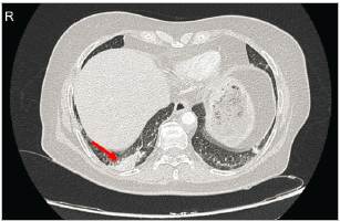 Figure 2 Axial section of the chest CT with contrast showing an area of right basal hypoperfusion (red arrow), which is conclusive for acute PTE of the right posterior basal segmental artery with apparent right posterior basal infarction.