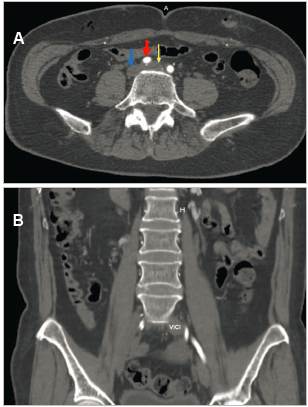 Figure 3 A (Top): left common iliac vein compression (yellow arrow) by the right common iliac artery (red arrow), causing venous dilation (16 mm), with mural thrombi inside. Inferior vena cava (blue arrow). B (Bottom): coronal abdominal-pelvic section showing left common iliac vein (LCIV) thrombosis with an increased diameter compared to the contralateral vein.