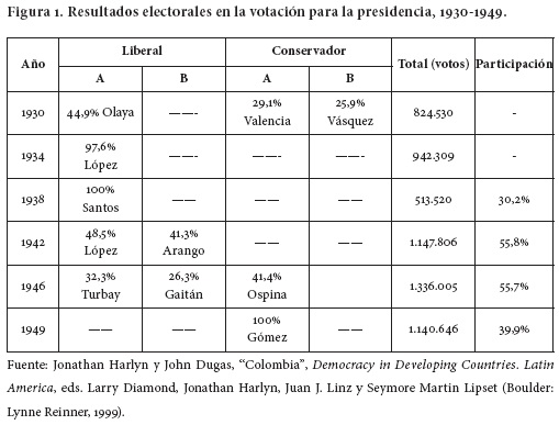 El monopolio electoral de los dos partidos tradicionales durante casi todo el siglo XX en Colombia se aprecia en las figuras 1 a 4, que revelan los resultados electorales presidenciales entre 1930 y 1998.