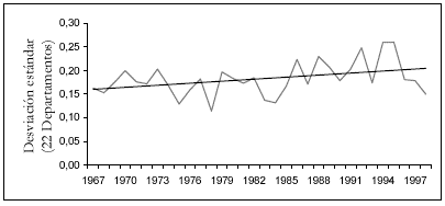 Un examen del comportamiento regional de la productividad industrial utilizando técnicas de convergencia agrega elementos adicionales para confirmar o rechazar la hipótesis de una supuesta reasignación industrial con fines de reducción de desequilibrios. En el gráfico 1 aparece la evolución de la desviación estándar o convergencia SIGMA,11 como una medida de la ampliación o reducción de las brechas interregionales de productividad. Allí se observa que la tendencia hacia la ampliación de las brechas se acentuó durante los noventa respecto al período de vigencia del modelo mixto de desarrollo.