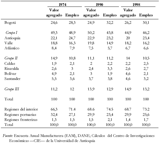 Durante la década de los noventa la industria colombiana además de perder peso en el PIB total,3 no mostró los cambios esperados en sus patrones de concentración geográfica y localización industrial. Pese a que algunas regiones periféricas elevaron sus participaciones en el valor agregado y en el empleo industrial, la concentración en Bogotá y los otros dos miembros del ''triángulo de oro'' persistió y la industria no se trasladó desde las regiones de mayor desarrollo que se encuentran situadas en el interior del país hacia las que poseen ventajas de localización por su facilidad de acceso a los mercados externos.