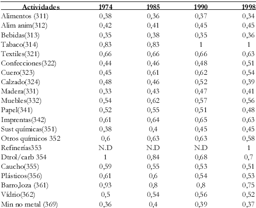 Durante la última década del siglo pasadoesta tendencia debía consolidarse con la asignación de recursos que traería la apertura; sin embargo, paradójicamente, se debilitó. En efecto, la concentración aumentó levemente solo para cinco de las agrupaciones-confecciones, metales no ferrosos, equipo profesional, manufacturas diversas y derivados del petróleo-, reduciéndose, aunque no sustancialmente, para las catorce restantes.