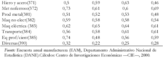El comportamiento de la productividad entre los dos períodos considerados es consistente con los patrones de distribución y la localización industrial caracterizados por el distanciamiento de Bogotá respecto a sus inmediatos seguidores (Valle y Antioquia) y la consolidación de una periferia especializada y con mejoramientos de eficiencia, pero débil en cuanto a externalidades y efectos regionales de arrastre sobre otras actividades.