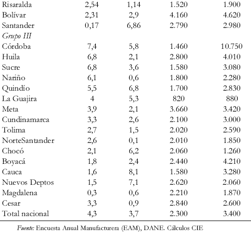 Un punto a resaltar en este examen es la caída de la tasa de crecimiento de la productividad durante el período de ajustes y reformas estructurales, a lo cual contribuyó el pobre desempeño en las regiones de mayor desarrollo tales como Antioquia y Valle. Tal caída no pudo contrarrestarse por las altas tasas que alcanzó la productividad en Cauca, Nuevos Departamentos credos con la Constitucion BNacional de 1991, Córdoba, Sucre, Santander Bolívar, Boyacá, Cundinamarca debido, entre otras razones, al poco peso que continúan teniendo estas regiones en la industria nacional. En la vía de desindustrialización por la que ha transitado la economía colombiana desde la segunda mitad de la década de los ochenta, este resultado demuestra que para finales de la década de los noventa los altos niveles y las elevadas tasas de crecimiento de la productividad industrial de estas regiones periféricas son el resultado de proyectos industriales aislados o dispersos y, por ende, con débiles enlaces. En este sentido, el aumento de productividad no es una manifestación de regiones ''ganadoras'', nuevos centros de actividad industrial, reasignación significativa de los recursos o conformación de sistemas de producción locales.