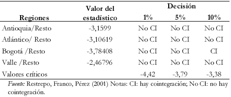 13. La noción de cointegración alude a la trayectoria común a través del tiempo que posee un conjunto de variables, no pudiendo separarse en el largo plazo. Puede también interpretarse como la exitencia de una realción lineal de equilibrio entre las variables.En el ejercicio Ln(yn-i)t = Aj + αj Ln yit + Eit donde yit: productividad del trabajo del departamento i en el año t; αj: parámetro que mide la respuesta de la productividad del bloque regional menos el departamento i a los factores comunes que dirigen la evolución de largo plazo de la productividad; Eit término de perturbación. Sobre esta técnica véase Novales (1993).